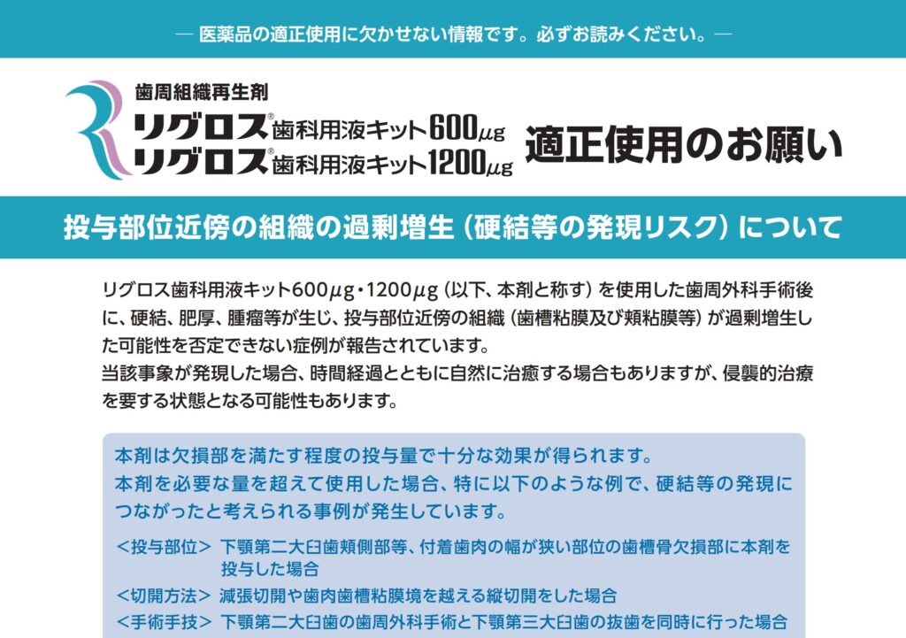専門医であれば予測できるようなリスクや注意点についても説明がなされないまま、不適切に治療が行われてしまっている例が見受けられます。特にグレーゾーン、すなわち再生療法の適応か不適応かの境界にある症例では、リグロスを本来の使用法でない方法で使用しなければ再生治療を行えない症例である場合があります。(参考文献1)