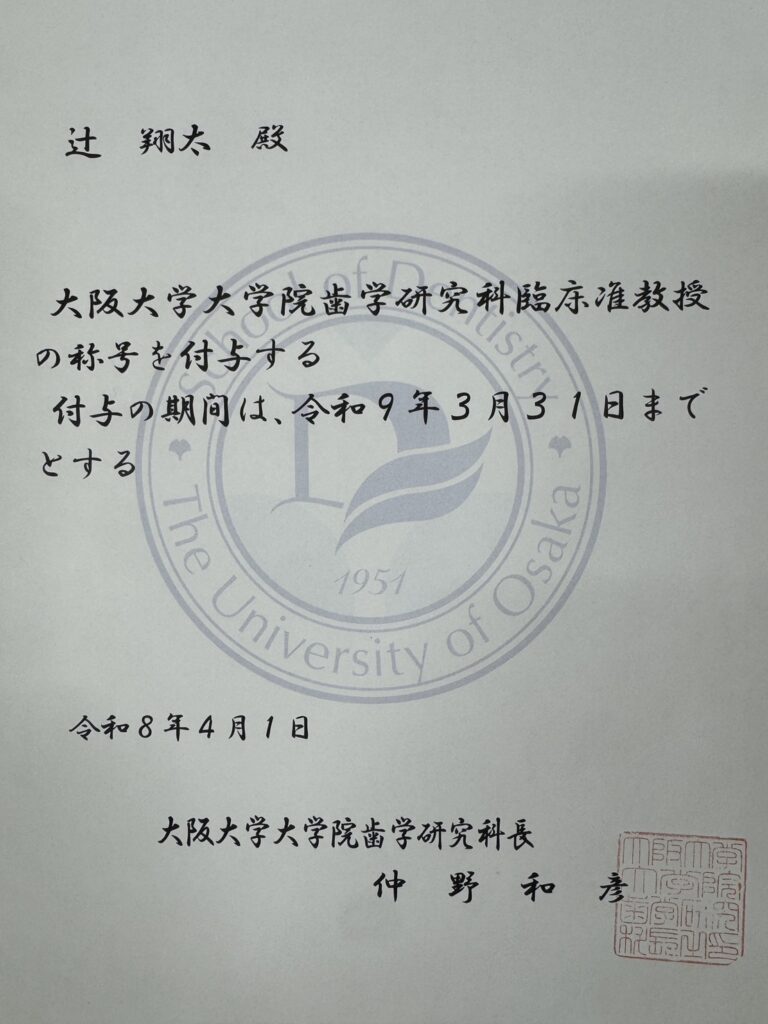 4月より大阪大学大学院歯学研究科口腔治療学講座(歯周科)の臨床准教授を拝命いたしました。重責に身が引き締まる思いですが、臨床と教育、どちらもこれまで以上に情熱を持って取り組んでいきたいと思います。